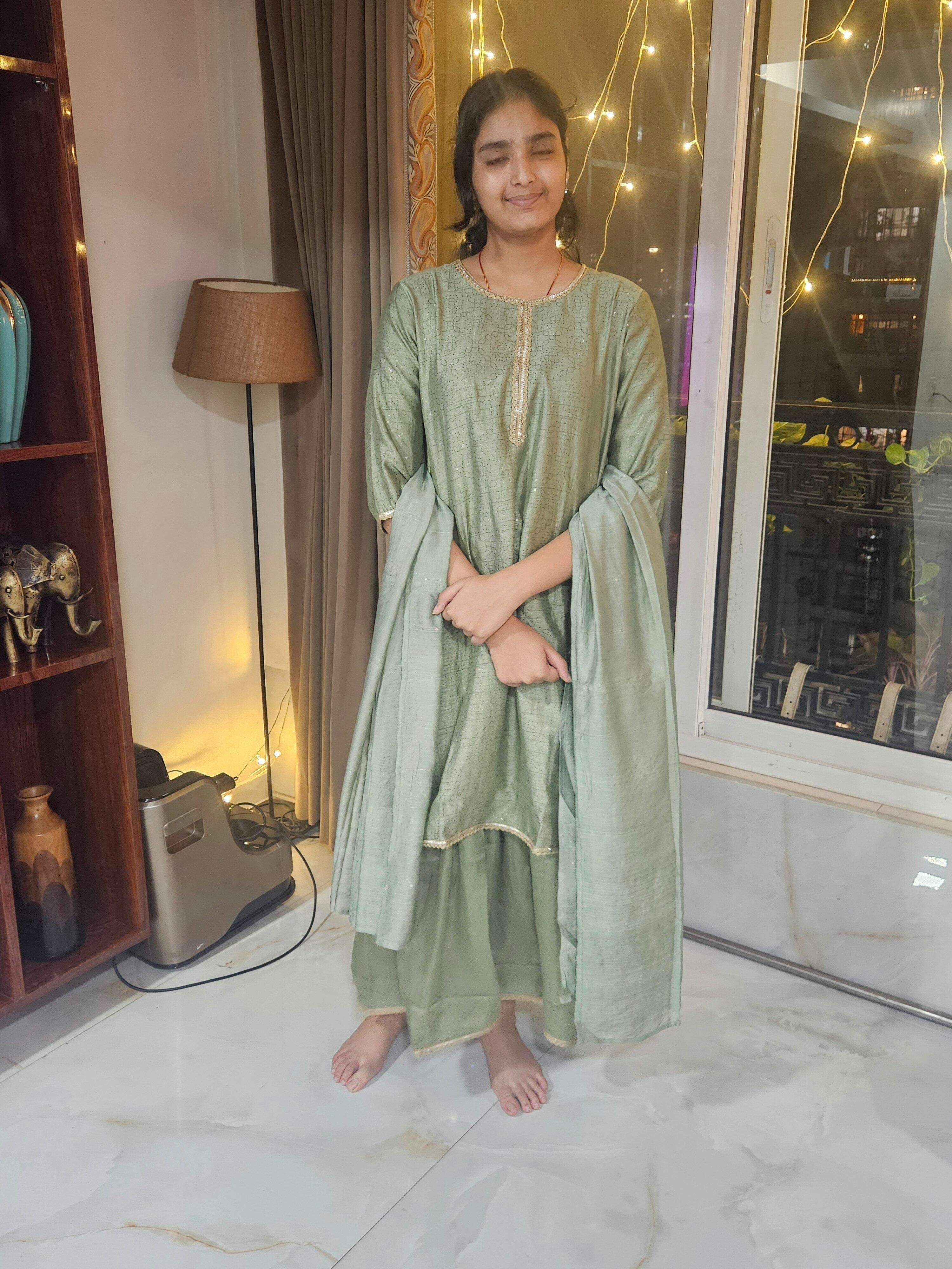 Add a refreshing charm to your ethnic wardrobe with this elegant three-piece set. Crafted in a soothing pastel green shade, the outfit features a straight-cut kurta with delicate lace trims, paired with flared sharara pants and a lightweight dupatta. Perfect for festive occasions, weddings, and family celebrations.