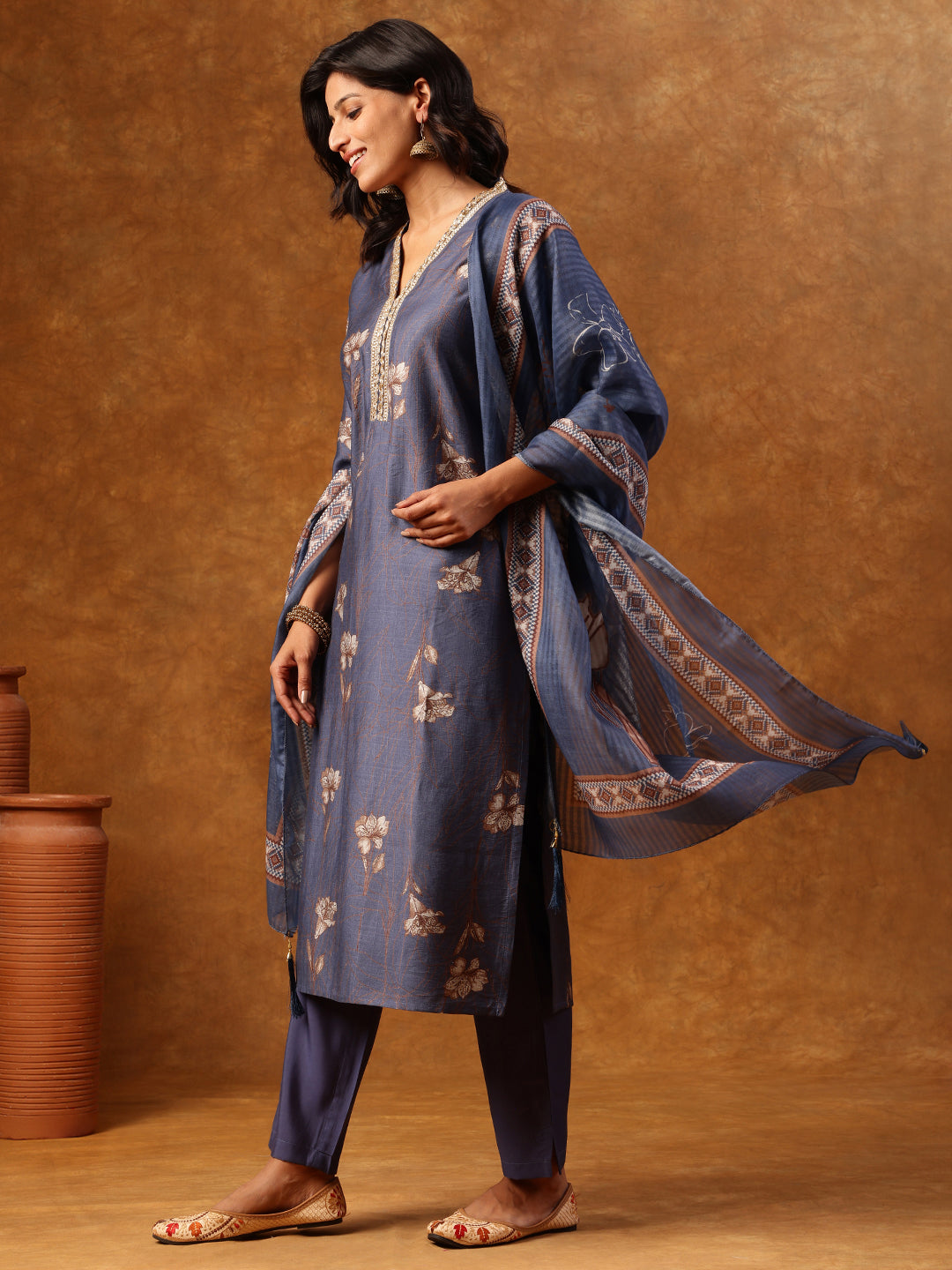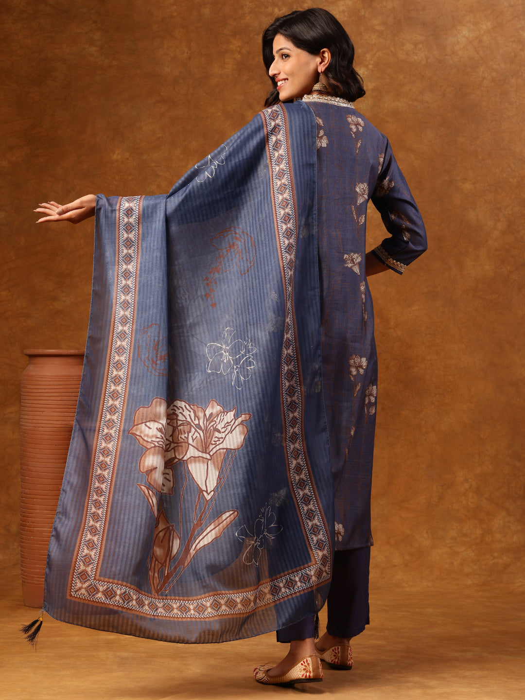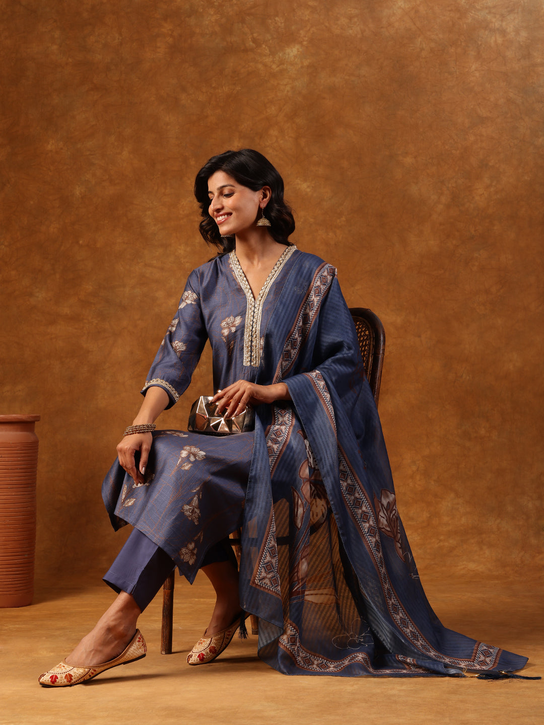Blue Floral Printed Silk Blend Kurta Set with Dupatta