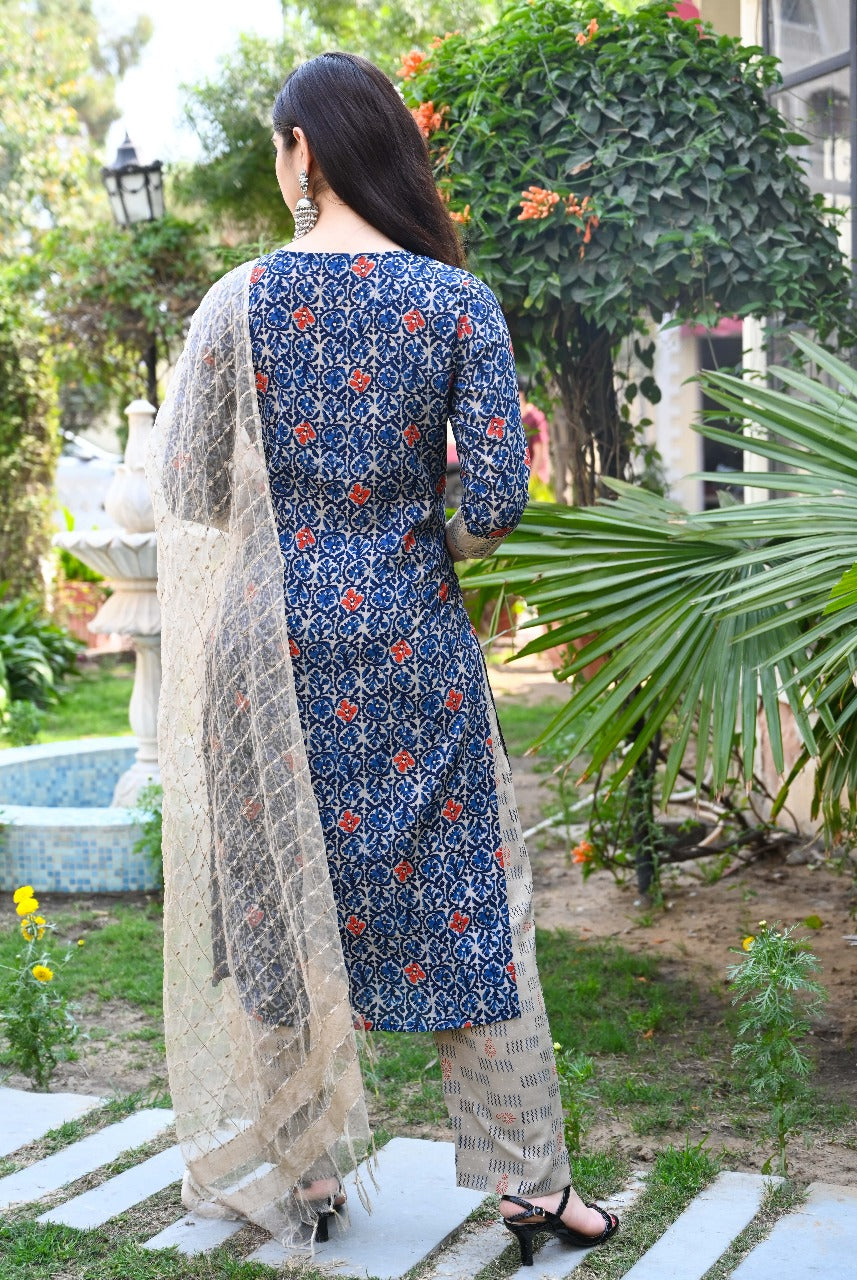 Elegant Blue Printed Cotton Suit Set with Dupatta