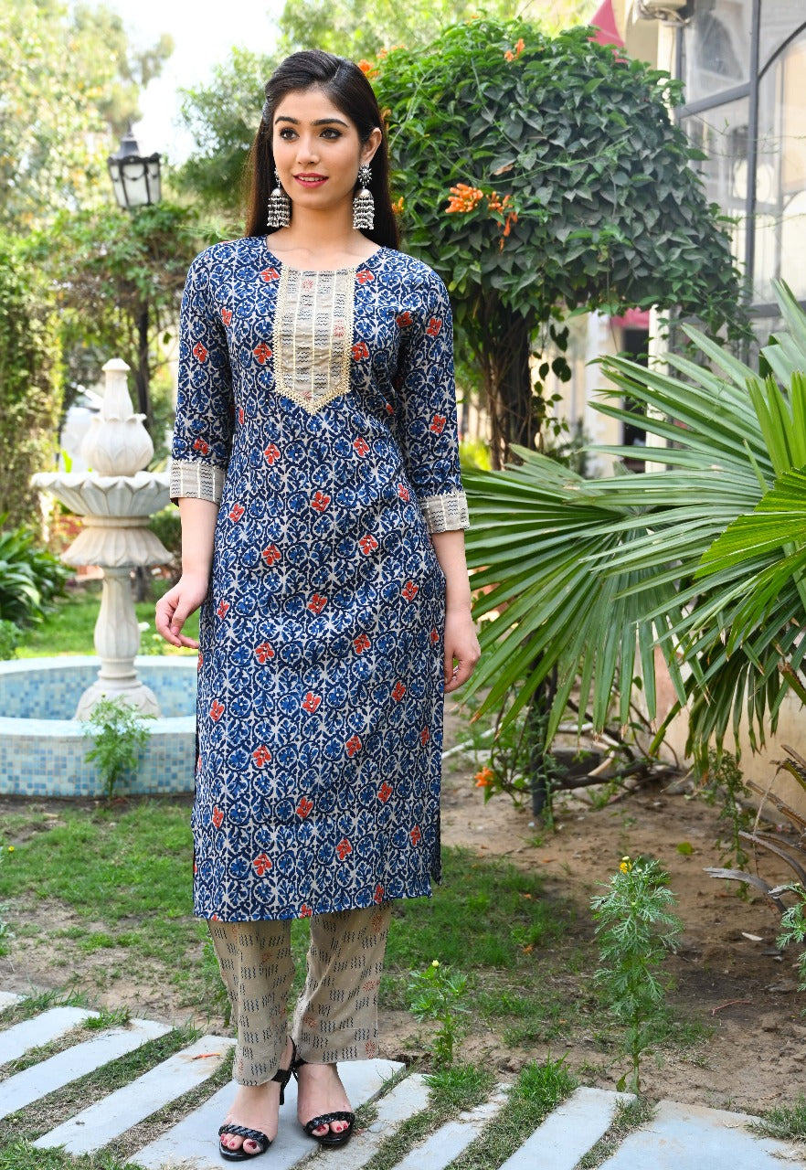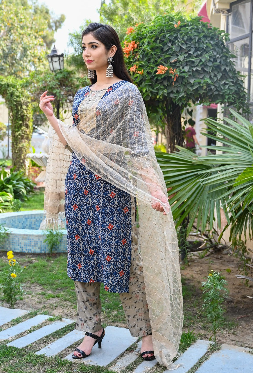 Step into effortless elegance with this beautifully crafted three-piece ethnic suit set. The navy blue straight-cut kurta features intricate floral prints in white and red, highlighted with a delicate neckline and sleeve borders. Paired with beige straight-fit pants adorned with subtle matching prints, this outfit strikes the perfect balance of comfort and sophistication. The sheer beige dupatta, detailed with tassels, adds a graceful finishing touch.