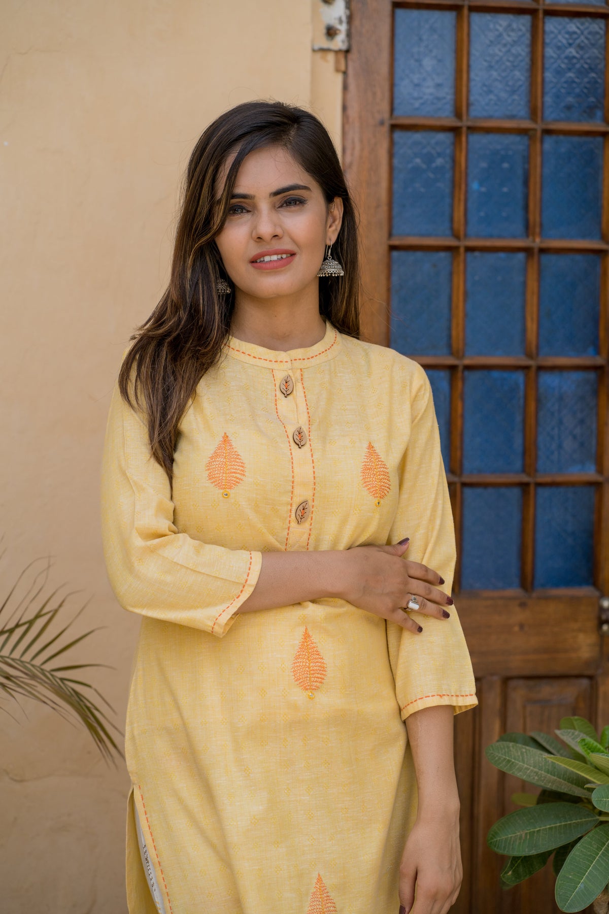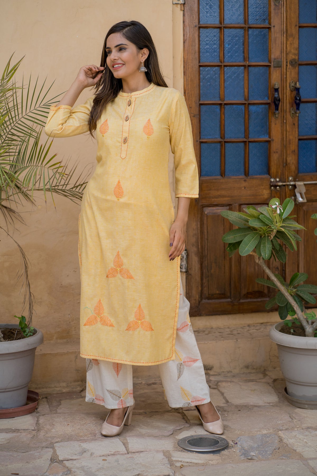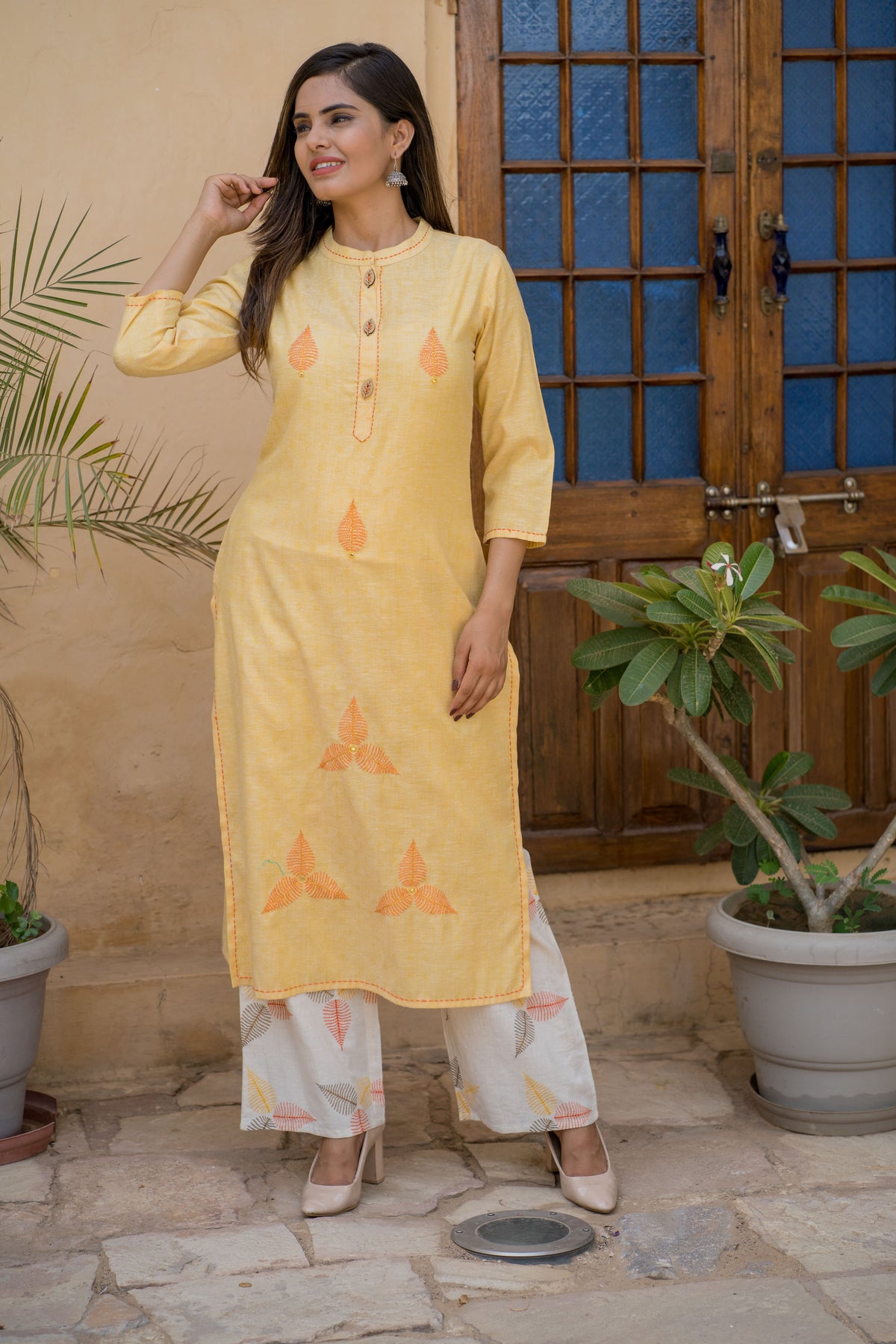 Brighten up your everyday look with this elegant yellow cotton blend kurta set, designed for comfort and style. The straight-cut kurta features delicate orange thread embroidery in leaf motifs, a band collar neckline with wooden buttons, and three-quarter sleeves. Paired with off-white palazzo pants adorned with multicolored leaf prints, this outfit strikes the perfect balance between simplicity and sophistication. Crafted from breathable cotton fabric, it ensures all-day comfort, making it ideal for casual outings, festive gatherings, or office wear.